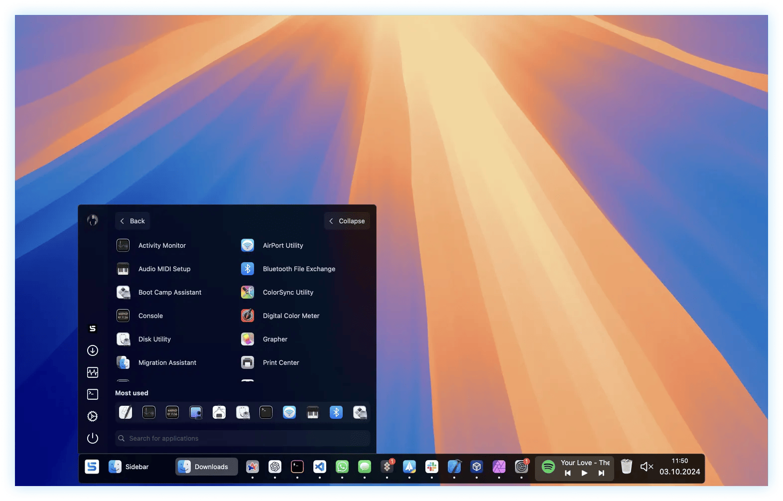 Sidebar 1.8.10 的应用启动器功能为习惯 Windows”开始菜单”或 Linux 应用启动器的用户提供了熟悉的体验。点击 Sidebar 标志会显示完整的应用程序列表,支持按名称搜索和常用应用推荐。这一界面还包括快速链接至系统设置、个人文件夹和电源选项(睡眠、重启、关机),使这些常用功能无需通过苹果菜单即可访问。