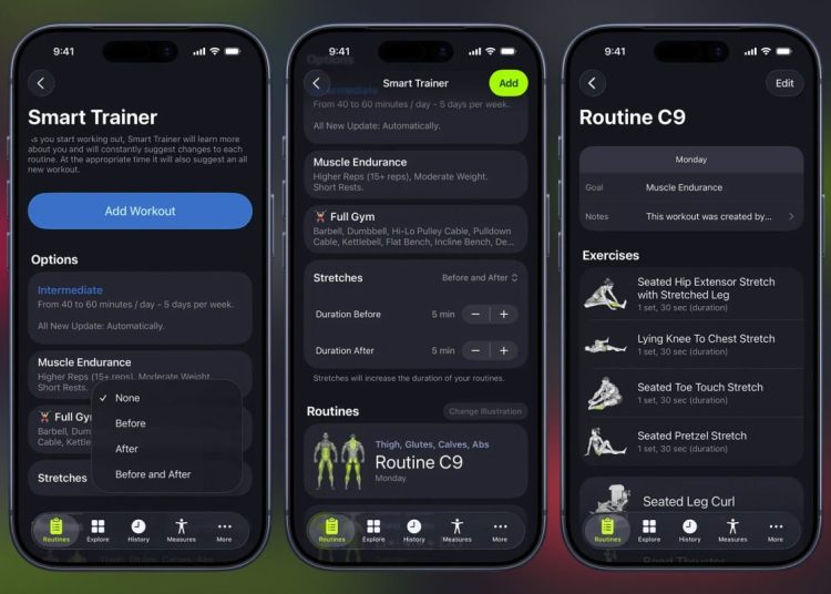 现在AI智能教练Smart Trainer会根据你当天的训练内容,自动推荐针对性的热身和放松拉伸动作,“精准对应你这套训练里练到的肌肉”。