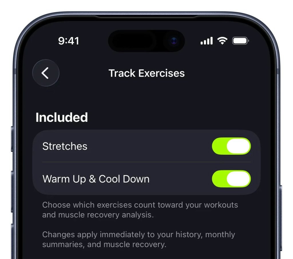 你可以自己决定每个部分的时长,还能选择热身和放松的拉伸时间要不要算进整体训练量和肌肉恢复分析里。