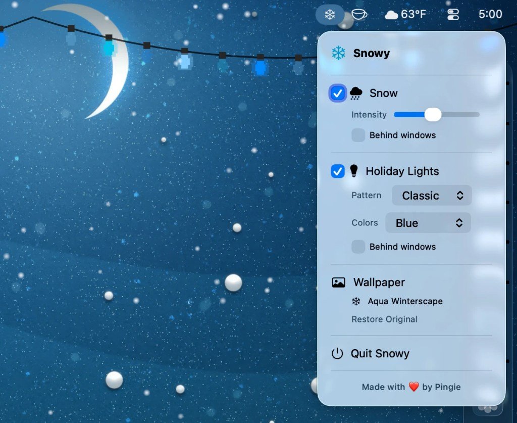 Snowy常驻于Mac菜单栏,可随时切换飘雪和节日灯效。您可选择永久显示飘雪,或让雪花隐藏在已打开的应用窗口后方。雪量强度也可从默认设置进行调整,控制飘雪密度。