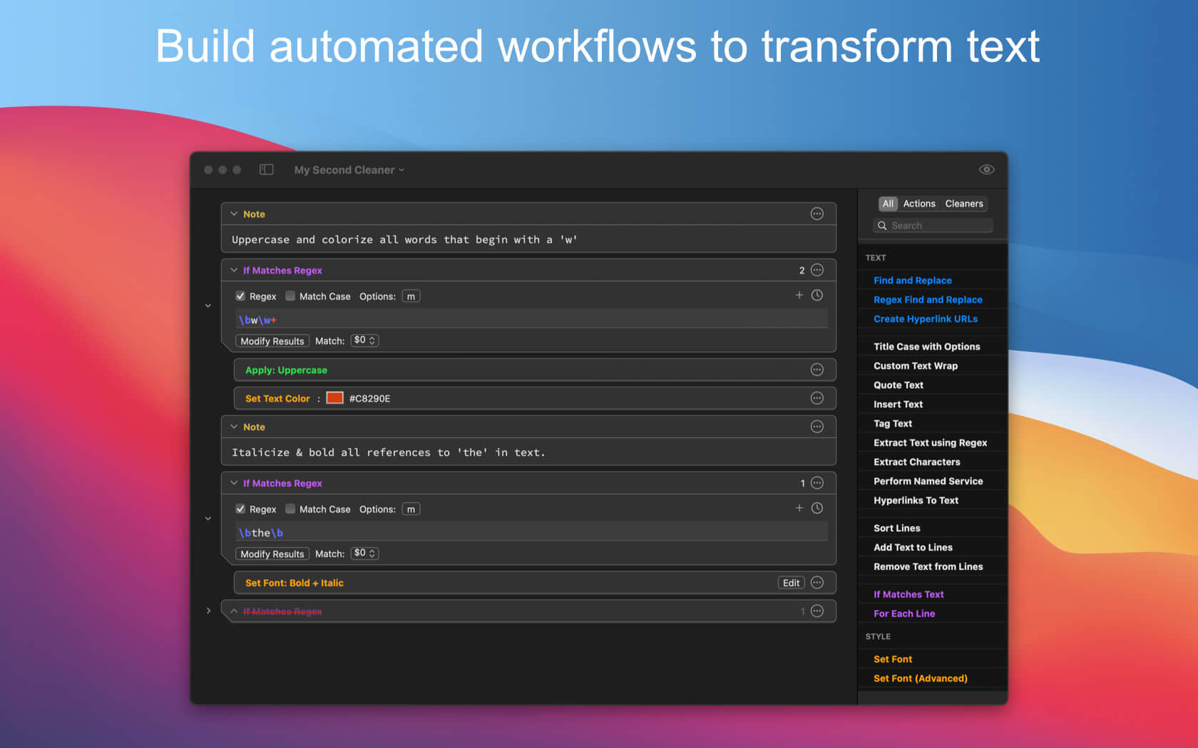 TextSoap是一款专为macOS设计的强大文本清理与格式化应用程序,旨在帮助用户快速处理从各种来源获取的混乱文本。它通过自动化清除不需要的字符、修正格式错误以及应用预设或自定义的文本转换规则,显著提升文字处理的工作效率。最新发布的9.6版本带来了一系列功能增强、性能改进和对新系统版本的兼容性支持。