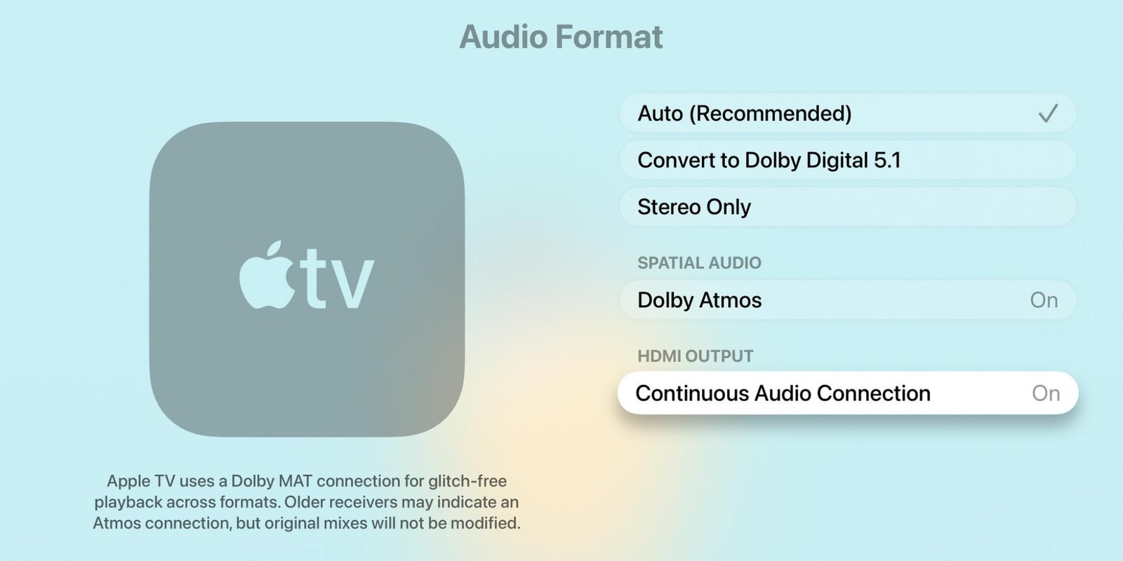 tvOS 26.4新增了一项名为“连续音频连接”的选项。你可以在“设置 → 视频与音频 → 音频格式”中,位于HDMI输出标题下找到它。