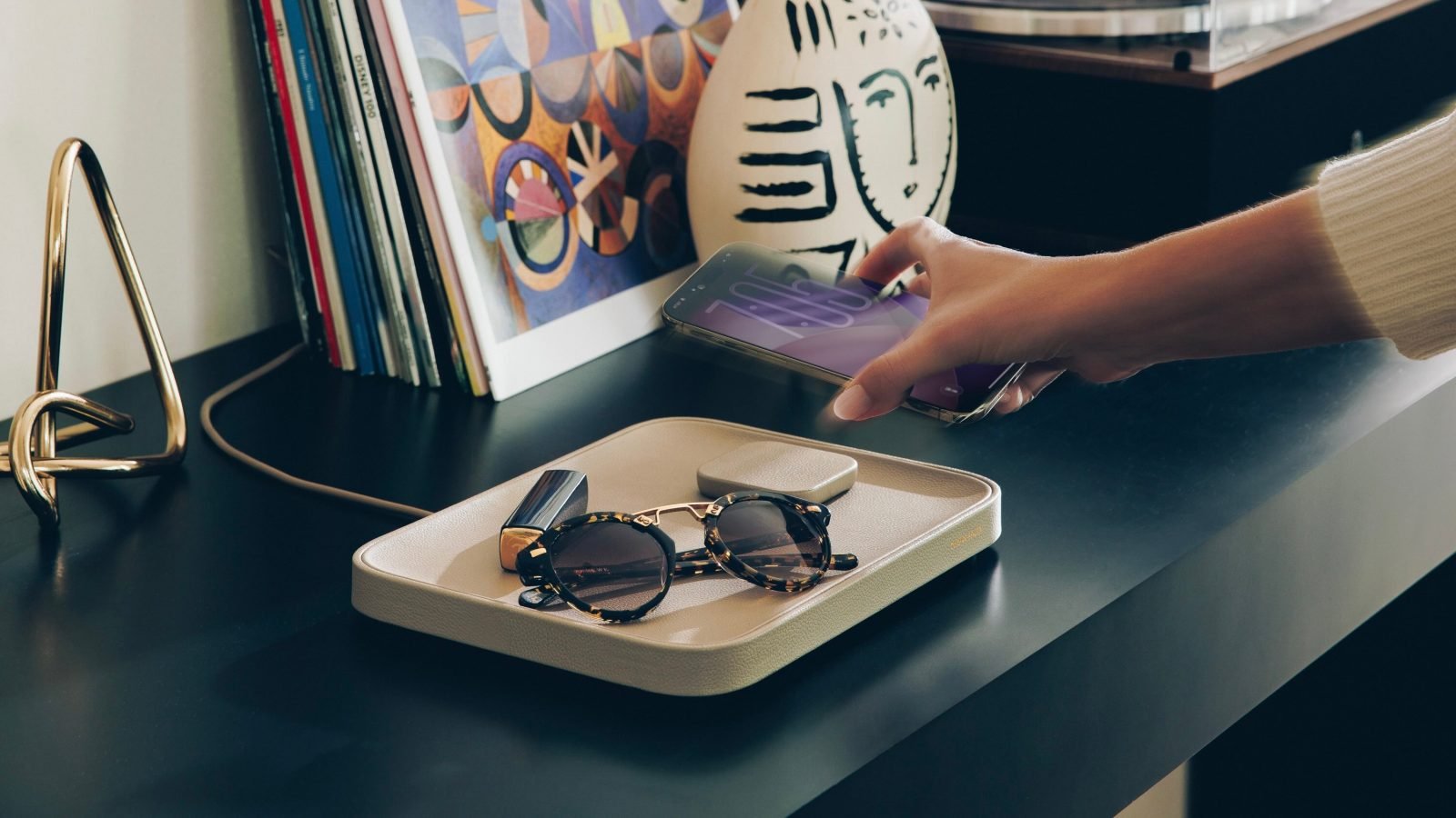 柔软的正方形充电垫与皮革托盘的建筑线条对齐。同时,加重的锌合金底座确保所有物品稳固有序。手机、钥匙、手表和钱包都能在托盘内找到自然的归宿。