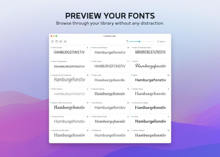 Typeface 不同于 macOS 自带的 Font Book,它更注重于视觉化和互动性。软件的核心在于字体探索功能,用户可以实时自定义预览文本、调整大小、颜色和布局,甚至模拟书籍、杂志或网站的环境。这让挑选字体不再是枯燥的任务,而是像在画廊中欣赏艺术品一样生动。通过灵活的网格视图,你能一览字体库的全貌,快速捕捉到那些能传达特定情感的字体选项。