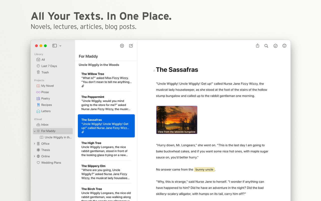 - 小说创作:Ulysses 适合长篇小说创作,尤其是在内容需要精细化管理和组织的情况下。其内建的章节和段落管理系统,能帮助作家清晰地规划故事架构和情节,避免写作中的混乱。