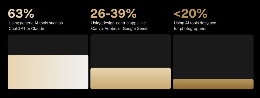 最后报告还提到,专为摄影设计的AI工具仍有很大发展空间,因为只有不到20%的受访者在使用这类工具。63%的人用的是ChatGPT、Claude这样的通用平台,最高39%的人在使用Canva或Adobe这类设计工具。