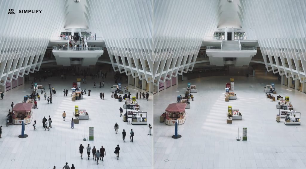 - Simplify:一键减少背景里的人群和视觉杂乱,让主体更突出,尤其适合城市、旅行或活动场景的热闹照片。