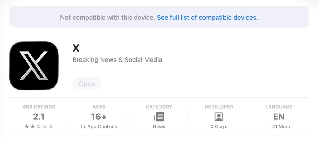 据该平台上的多位用户发现,X的iPad版本在Mac App Store的列表现在显示该应用不支持在Mac上运行。